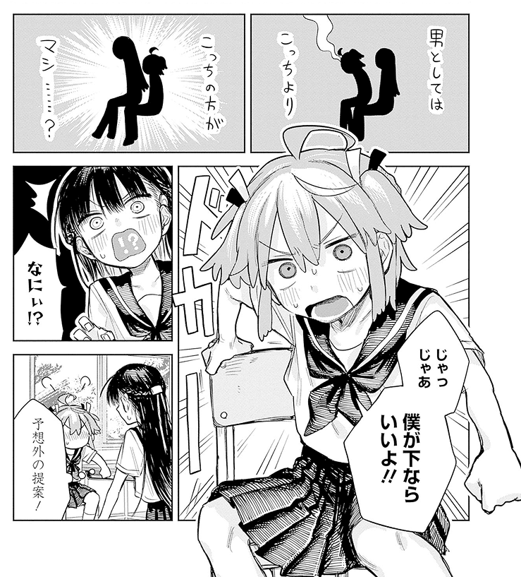 世界めちゃくちゃ可愛いですね。僕の大好きなタイプの絵柄です。男の子に見える女の子、女の子に見える男の子を描くって、すごく難しいと思うんですが、その絶妙なラインを完璧に突いてきてます。髪型や眉の細さ、体操服や私服といった服装での印象の差まで細かく描き分けられていて、読んでいて感心します。それに、キャラクターの表情や仕草が丁寧で、背景や学校の描写も細かい。男子キャラも置いてけぼりにせず、ちゃんと物語に巻き込んでいるところもいいですね。