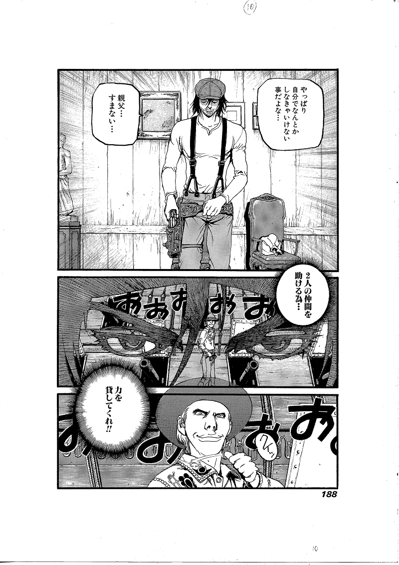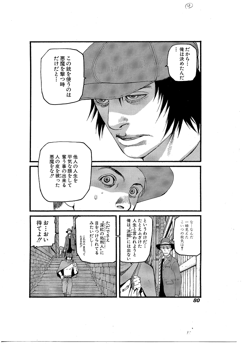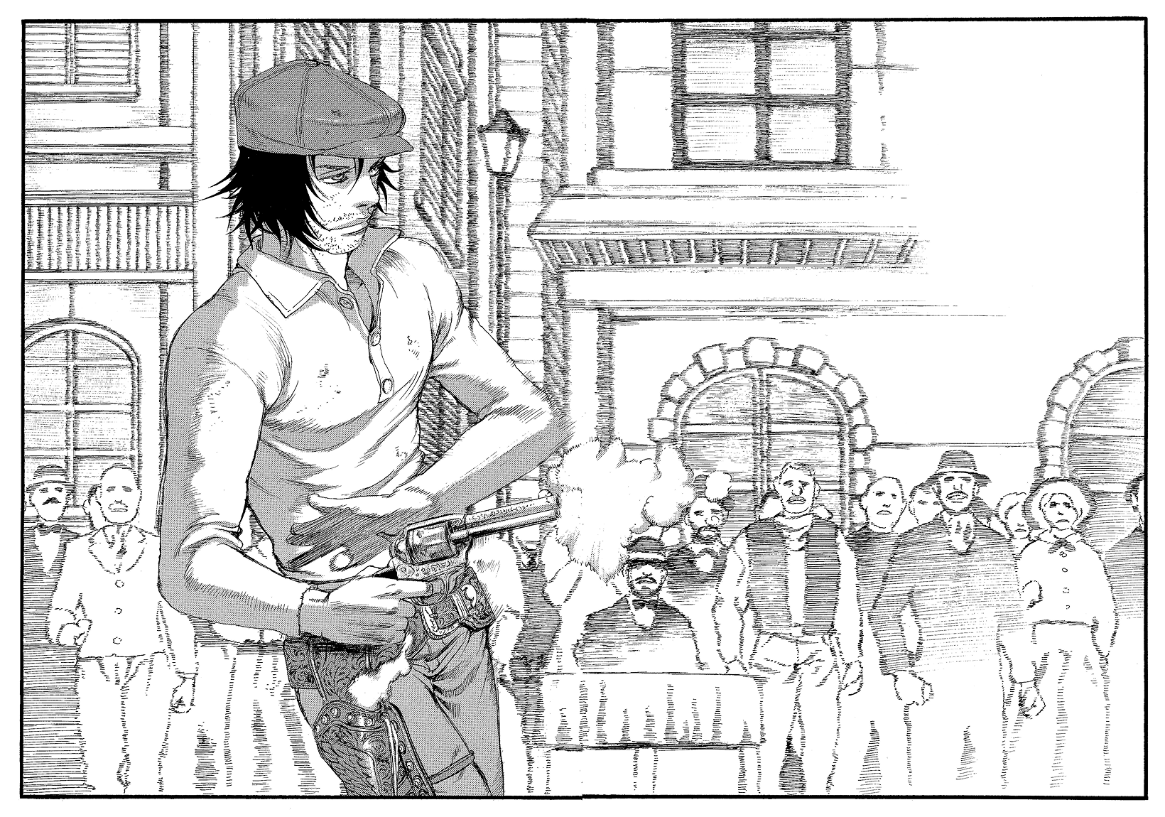 池田スピーディーなマンガだなと思いました。依頼者や出てくる敵とか、ずっとテンポ感よく見せられてるなっていう感じがします。そしてインパクトのあるシーンで凄い印象づけられるし、凄いマンガだなと、びっくりしました。十三は頭に銃が付いてて、表情とかわからないはずなのに、なぜか表情がわかるっていう。「これは何でなんだろう?」って思いましたね。身体の描き方なのか、仕草とかなのか…。このキャラクターで物語を描ききるという、作者の意気込みが凄いと感じました。